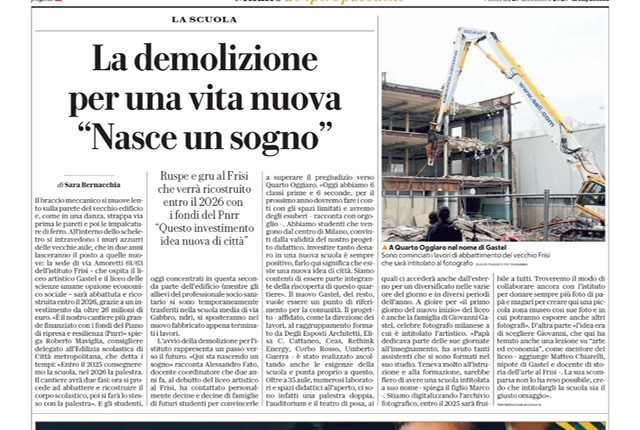 La delegazione del Frisi, guidata dal Prof. Alessandro Fato, coordinatore didattico del liceo, e dal Sig. Filippo Campo, direttore sga, e quella della Città Metropolitana di Milano, guidata dal Consigliere Delegato dott. Roberto Maviglia, hanno assistito all’avvio dei lavori, alla presenza di numerosi giornalisti; sono stati presenti l’architetto Lorenzo Degli Esposti, autore del progetto che si andrà a realizzare e direttore dei lavori, Marco Gastel ed il Prof. Matteo Chiarelli, rispettivamente figlio e nipote di Giovanni Gastel a cui il nuovo Liceo é intitolato.